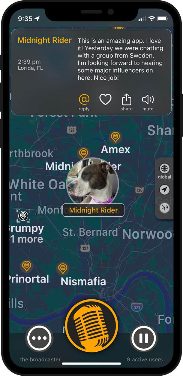 When you record and broadcast, a spot is placed on the map showing the approximate location of your broadcast. Don't worry, others will never know your exact location. Tap the spots on the map to listen to other's broadcasts made in your favorite places!